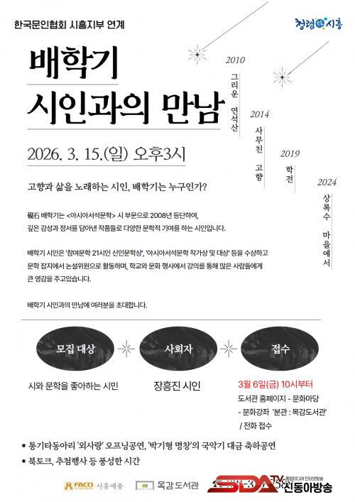 À̹ø ¸¸³²Àº 3¿ù 15ÀÏ ¿ÀÈÄ 3½Ã, ¸ñ°¨µµ¼°ü ÁöÇÏ 1Ãþ ´Ù¸ñÀû½Ç¿¡¼ ÁøÇàµÇ¸ç, ½Ã¿Í ¹®Çп¡ °ü½ÉÀÌ ÀÖ´Â 50¿© ¸íÀÇ ½Ã¹Î°ú ÇÔ²²ÇÑ´Ù. ½ÃÀÎÀÌ Á÷Á¢ ÀÚ½ÅÀÇ ÀÛǰÀ» ³¶µ¶Çϰí, ½Ã¸¦ ¾²°Ô µÈ °è±â¿Í âÀÛ °úÁ¤¿¡ °üÇÑ À̾߱⸦ µé·ÁÁÙ ¿¹Á¤ÀÌ´Ù. ¶ÇÇÑ, ½Ã¹Îµé°ú ÀÚÀ¯·Ó°Ô Áú¹®À» ³ª´©¸ç ½Ã¿Í »î¿¡ ´ëÇØ Æí¾ÈÇÏ°Ô ´ëÈÇÏ´Â ½Ã°£µµ ¸¶·ÃµÈ´Ù.