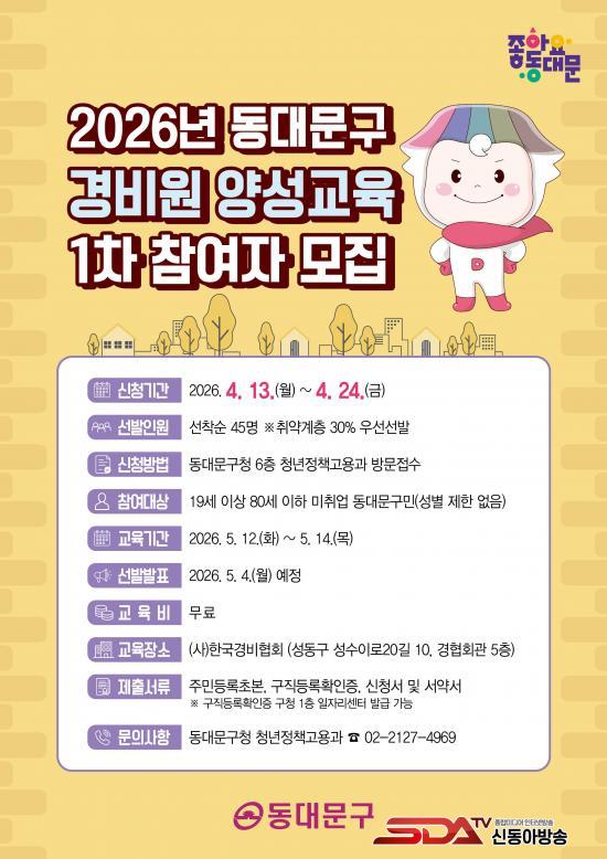 ¸ðÁýÀº 4¿ù 13ÀϺÎÅÍ 4¿ù 24ÀϱîÁö ¼±Âø¼ø 45¸íÀ» ´ë»óÀ¸·Î ÁøÇàµÇ¸ç, ÀÌ Áß 30%´Â Ãë¾à°èÃþÀ» ¿ì¼± ¼±¹ßÇÏ¿© »çȸÀû ¹è·Á°¡ ÇÊ¿äÇÑ ±¸¹Îµé¿¡°Ô ¿ì¼±ÀûÀÎ ±âȸ¸¦ Á¦°øÇÑ´Ù. ¼±¹ßµÈ Âü¿©ÀÚµéÀº 5¿ù 12ÀϺÎÅÍ 14ÀϱîÁö 3Àϰ£ÀÇ ±³À°À» ÅëÇØ °æºñ ¾÷¹«¿¡ ÇÊ¿äÇÑ Àü¹® ¿ª·®À» °®Ãß°Ô µÈ´Ù.