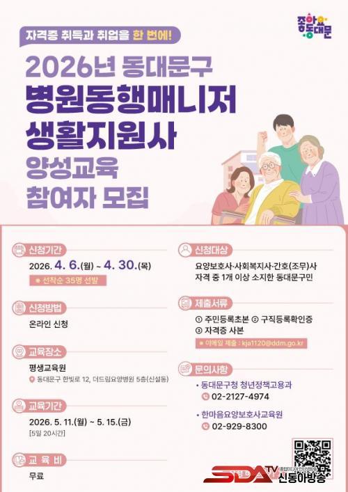 ¿ÃÇØ ½Å±Ô·Î ÃßÁøµÇ´Â ¡®º´¿øµ¿Çà¸Å´ÏÀú¡¤»ýȰÁö¿ø»ç¡¯ ¾ç¼º ±³À°Àº ÃÖ±Ù ¼ö¿ä°¡ Áõ°¡Çϰí ÀÖ´Â µ¹º½¡¤º¹Áö ºÐ¾ß Ãë¾÷À» Èñ¸ÁÇÏ´Â ±¸¹ÎÀ» ´ë»óÀ¸·Î ÇÑ´Ù. ¸ðÁý ±â°£Àº 4¿ù 6ÀϺÎÅÍ 4¿ù 30ÀϱîÁö·Î ¼±Âø¼ø 35¸íÀ» ¼±¹ßÇϸç, ±³À°Àº 5¿ù 11ÀϺÎÅÍ 15ÀϱîÁö 5Àϰ£ ÁøÇàµÈ´Ù.