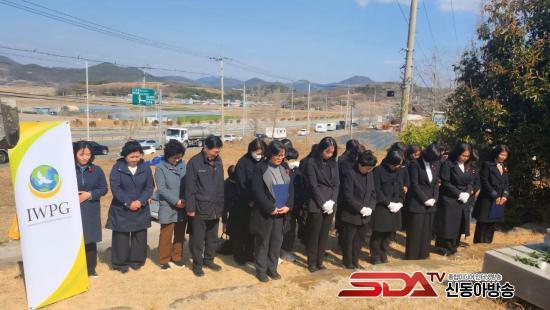 »çÁø= IWPG ¿©¼öÁöºÎ°¡ À±Çü¼÷ ¿­»çÀÇ ¹¦ ¾Õ¿¡¼­ űر⸦ µé¸ç ¿­»çÀÇ ¶æÀ» ±â³äÇϰí ÀÖ´Ù.