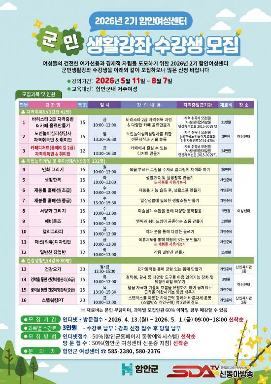 À̹ø °Á´ ¿À´Â 5¿ù 11ÀϺÎÅÍ 8¿ù 7ÀϱîÁö 12ÁÖ°£ ¿î¿µµÇ¸ç, ÃÑ 16°³ °Á·Π±¸¼ºµÈ´Ù. ¸ðÁý ´ë»óÀº °ü³» °ÅÁÖ ¿©¼ºÀ¸·Î, ¸ðµç °úÁ¤Àº ¼±Âø¼øÀ¸·Î ½Åû¹Þ´Â´Ù.