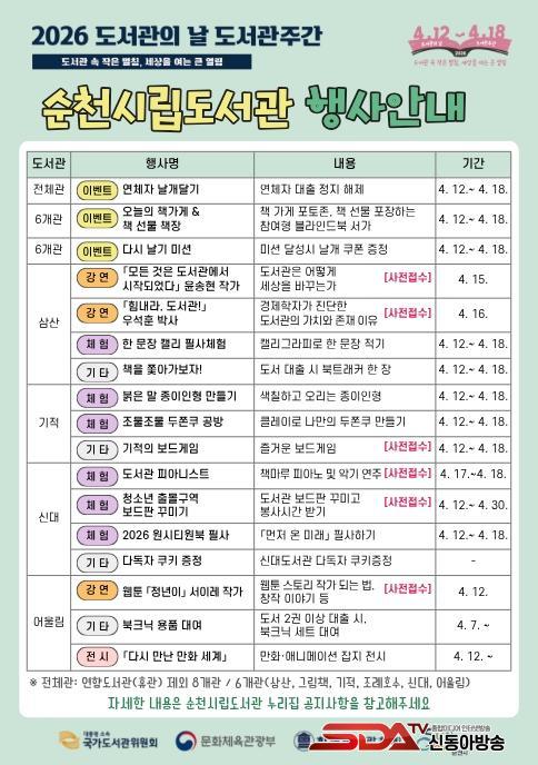 [½Åµ¿¾Æ¹æ¼Û ¼øÃµ=±è¿ëÈÆ ±âÀÚ] ¼øÃµ½Ã´Â ¿À´Â 12ÀϺÎÅÍ 18ÀϱîÁö ¡®µµ¼­°üÀÇ ³¯¡¯ ¹× ¡®µµ¼­°ü ÁÖ°£¡¯À» ¸Â¾Æ ¼øÃµ½Ã 8°³ µµ¼­°ü¿¡¼­ °­¿¬, üÇè, Àü½Ã µî µ¶¼­¹®È­Çà»ç¸¦ ¿î¿µÇÑ´Ù°í ¹àÇû´Ù.