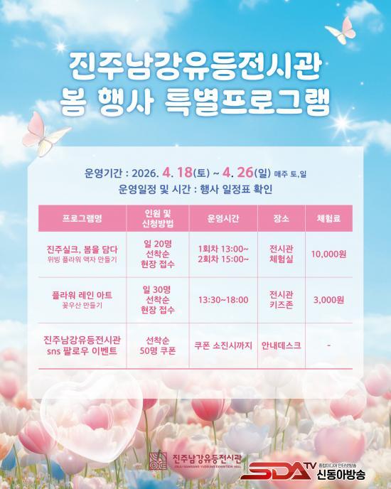 ÁøÁÖ³²°­À¯µîÀü½Ã°üÀº ¿À´Â 4¿ù 18ÀϺÎÅÍ 26ÀϱîÁö ¸ÅÁÖ ÁÖ¸», Àü½Ã°üÀ» ã´Â ¹æ¹®°´µéÀÌ Á÷Á¢ Âü¿©Çϰí Áñ±æ ¼ö ÀÖ´Â ¡®À¯µî°ú ÇÔ²²ÇÏ´Â º½¸ÂÀÌ Çà»ç¡¯¸¦ °³ÃÖÇÑ´Ù°í ¹àÇû´Ù.