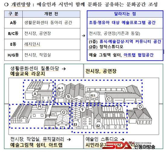 ±âÁ¸ ·¹Áö´ø½Ã °ø°£(Eµ¿)Àº È®Àå°ø»ç¸¦ ÅëÇØ ½Ã¹Î°ú ¿¹¼úÀÎÀÌ ÇÔ²² ¸Ó¹°°í ¼ÒÅëÇÏ´Â º¹ÇÕ °ø°£À¸·Î À籸¼ºµÈ´Ù. 1Ãþ¿¡´Â »ó¼³ Àü½ÃÀå°ú ÈÞ½Ä ±â´ÉÀ» °®Ãá ¡®½Ã¹Î¶ó¿îÁö¡¯°¡, 2Ãþ¿¡´Â ¿¹¼ú°¡µéÀÇ Ã¢ÀÛȰµ¿À» Áö¿øÇÏ°í ±¹³»¿Ü ±³·ù, Áö¿ª»çȸ¿ÍÀÇ Çù¾÷ÀÌ ÀÌ·ïÁö´Â ¡®Ã¢ÀÛ½ºÆ©µð¿À¡¯°¡ µé¾î¼±´Ù
