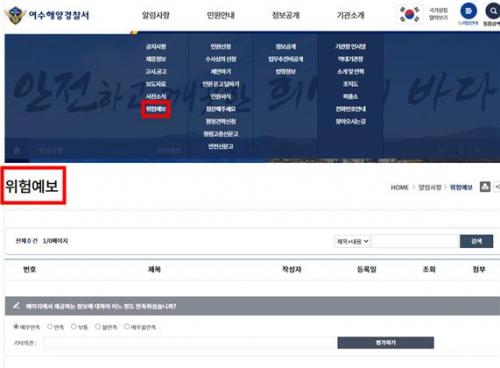 [½Åµ¿¾Æ¹æ¼Û¿©¼ö=±è±â³² ±âÀÚ] ¿©¼öÇØ¾ç°æÂû¼­(¼­Àå ÃÖ°æ±Ù)´Â ¡°±¹¹ÎµéÀÌ ÇØ¾ç¿¡¼­ÀÇ À§ÇèÁ¤º¸ Á¢±Ù¼º Çâ»ó°ú ¾ÈÀü»ç°í ¿¹¹æÀ» À§ÇØ ´©¸®Áý¿¡ À§Ç迹º¸ °Ô½ÃÆÇÀ» ½Å¼³ ¿î¿µÇÑ´Ù¡±°í ¹àÇû´Ù. ¿©¼öÇØ°æ¿¡ µû¸£¸é ÇöÀç À§Ç迹º¸Á¦ 3Á¾(¼ö³­±¸È£/¿¬¾È ¾ÈÀü»ç°í/ÇØ¾ç¿À¡¦
