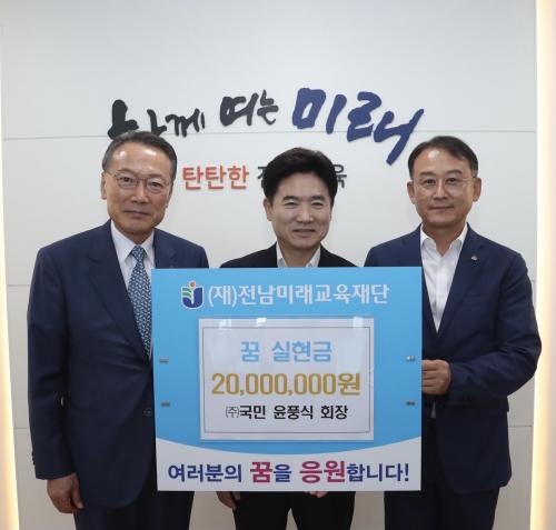 [½Åµ¿¾Æ¹æ¼Û Àü³²¿©¼ö=À̽ŵ¿±âÀÚ]À±Ç³½Ä ¢ß±¹¹Î ȸÀåÀÌ 12ÀÏ Àü³²¹Ì·¡±³À°Àç´Ü(ÀÌ»çÀå ±è´ëÁß)¿¡ ²Þ ½ÇÇö±Ý 2,000¸¸¿øÀ» Àü´ÞÇßÀ¸¸ç, ±âŹ½Ä¿¡´Â ¼Õ¼¼Çö ¢ß±¹¹Î»ê¾÷ ȸÀåµµ ÇÔ²² Âü¼®Çß´Ù. ²Þ ½ÇÇö±ÝÀº ÀÏȸ¼º ÀåÇбÝÀÌ ¾Æ´Ñ, ÇлýµéÀÌ ÀÚ½ÅÀÇ ²ÞÀ» ¼³°èÇϰí ÀÚ±âÁÖ¡¦