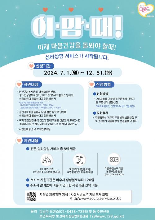 [½Åµ¿¾Æ¹æ¼Û °­³²±¸=À̽ŵ¿±âÀÚ]°­³²±¸°¡ 7¿ù 1ÀϺÎÅÍ ¿ì¿ï¡¤ºÒ¾È µî Á¤¼­Àû ¾î·Á¿òÀ» °Þ´Â ±¸¹ÎÀÌ Àü¹®ÀûÀÎ ½É¸®»ó´ã ¼­ºñ½º¸¦ ¹ÞÀ» ¼ö ÀÖ´Â ¡®¸¶À½ÅõÀÚ Áö¿ø»ç¾÷¡¯À» ½ÃÇàÇÑ´Ù. ÃÖ±Ù Á¤½Å°Ç°­ÀÇ Á߿伺ÀÌ Ä¿Áö¸é¼­ ¿ì¿ï¡¤ºÒ¾È¡¤½ºÆ®·¹½º µîÀÌ ÁßÁõ ÁúȯÀ¸·Î ¹ßÀüÇÏ¡¦