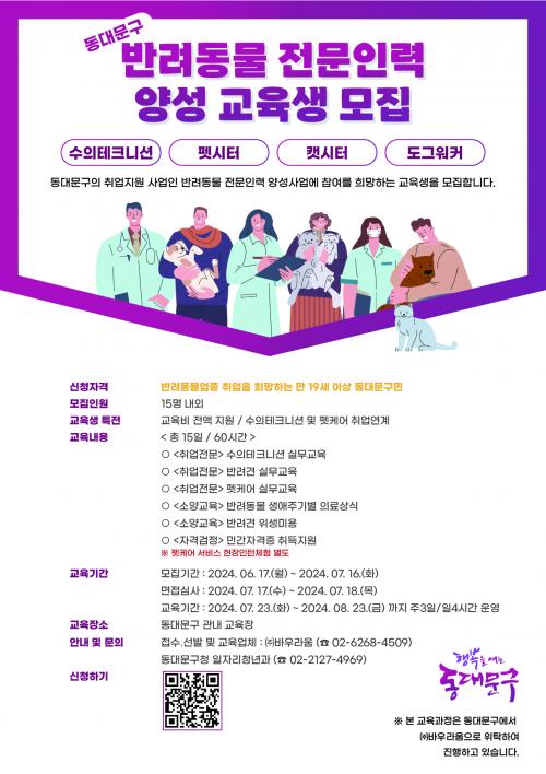 [½Åµ¿¾Æ¹æ¼Û µ¿´ë¹®±¸=À̽ŵ¿±âÀÚ]¼­¿ï µ¿´ë¹®±¸°¡ 7. 16.(È­)±îÁö ¡®¹Ý·Áµ¿¹° Àü¹® Àη ¾ç¼º »ç¾÷(1±â)¡¯ Âü¿©ÀÚ¸¦ ¸ðÁýÇÑ´Ù. ¹Ý·Áµ¿¹° »ê¾÷¿¡¼­ ¼ö¿ä°¡ ³ôÀº ¡®¼öÀÇÅ×Å©´Ï¼Ç(µ¿¹°º¸°Ç»ç)¡¯°ú ¡®ÆêÄɾî(Æê½ÃÅÍ, Ĺ½ÃÅÍ, µµ±×¿öÄ¿)¡¯¿¡ ´ëÇÑ ±³À°À» ½Ç½ÃÇØ Àü¹® Àη¡¦