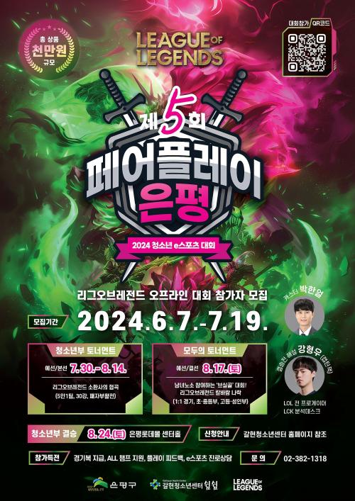 [½Åµ¿¾Æ¹æ¼Û ÀºÆò±¸=À̽ŵ¿±âÀÚ]ÀºÆò±¸´Â û¼Ò³âµéÀÇ ¿©°¡ Ȱµ¿À» Áö¿øÇÏ°í °ÇÀüÇÑ °ÔÀÓ¹®È­ Á¤ÂøÀ» À§ÇÑ ¡®2024. Á¦5ȸ ÀºÆò±¸ û¼Ò³â e½ºÆ÷Ã÷ ´ëȸ¡¯ Âü°¡ÀÚ¸¦ ³»´Þ 19ÀϱîÁö ¸ðÁýÇÑ´Ù. ´ëȸ Á¾¸ñÀº Àαâ e½ºÆ÷Ã÷ÀÎ ¡®¸®±×¿Àºê·¹Àüµå(LOL, league of legend)¡¯´Ù. ¡¦
