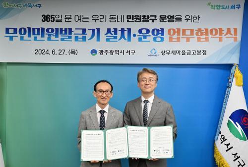 [½Åµ¿¾Æ¹æ¼Û=ÀÌÁöÇö±âÀÚ] ±¤ÁÖ±¤¿ª½Ã ¼­±¸(±¸Ã»Àå ±èÀ̰­)¿Í »ó¹«»õ¸¶À»±Ý°í(ÀÌ»çÀå ±è¿ùÃâ)°¡ ÁֹεéÀÇ ¹Î¿ø ÆíÀÇ ÁõÁøÀ» À§ÇØ ¼ÕÀ» ¸ÂÀâ¾Ò´Ù. ¾ç ±â°üÀº 27ÀÏ »ó¹«»õ¸¶À»±Ý°í º»Á¡ ³» ¹«Àιοø¹ß±Þ±â¸¦ ½Å±Ô ¼³Ä¡Çϰí, »óÈ£ Çù·Â°ü°è¸¦ ¹ÙÅÁÀ¸·Î È¿À²ÀûÀÎ ¿î¿µÀ» À§ÇØ¡¦