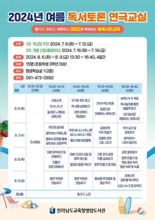 [½Åµ¿¾Æ¹æ¼Û Àü³²¿©¼ö=À̽ŵ¿±âÀÚ]Àü¶ó³²µµ±³À°Ã»¿µ¾Ïµµ¼­°ü(±¸. ¿µ¾Ï°ø°øµµ¼­°ü)Àº 2024³â ¿©¸§¹æÇÐÀ» ¸Â¾Æ ¿µ¾Ï Áö¿ª ÃʵîÇлý 3Çгâ ÀÌ»ó 15¸íÀ» ´ë»óÀ¸·Î¡¸¿©¸§ µ¶¼­Åä·Ð ¿¬±Ø±³½Ç¡¹À» ¿î¿µÇÑ´Ù. À̹ø ¿©¸§ µ¶¼­Åä·Ð ¿¬±Ø±³½ÇÀº ¡¸Áñ±â°í, ¸Àº¸°í, üÇèÇÏ°í ¡¦
