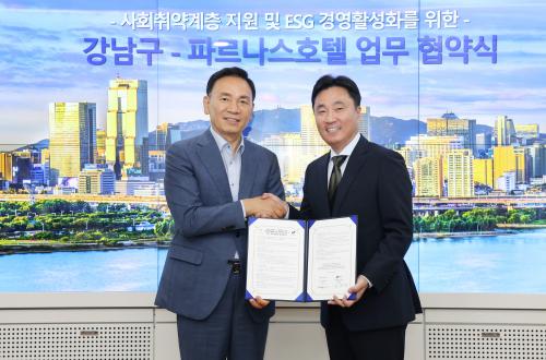 [½Åµ¿¾Æ¹æ¼Û=À̽ŵ¿±âÀÚ]²ÞÀÌ ¸ðÀÌ´Â µµ½Ã, ¹Ì·¡¸¦ ±×¸®´Â °­³²±¸(±¸Ã»Àå Á¶¼º¸í)°¡ 19ÀÏ ±¸Ã» º»°ü¿¡¼­ ÆÄ¸£³ª½ºÈ£ÅÚ(´ëÇ¥ÀÌ»ç ¿©ÀÎâ)°ú ¡®»çȸÃë¾à°èÃþÀ» À§ÇÑ °øµ¿»ç¾÷ ¹× ESG °æ¿µ Ȱ¼ºÈ­ ÃßÁø ¾÷¹«Çù¾à¡¯À» ü°áÇß´Ù. ¾ç ±â°üÀº Çù¾àÀ» ÅëÇØ °ü³» Ãë¾à°èÃþÀ» À§¡¦