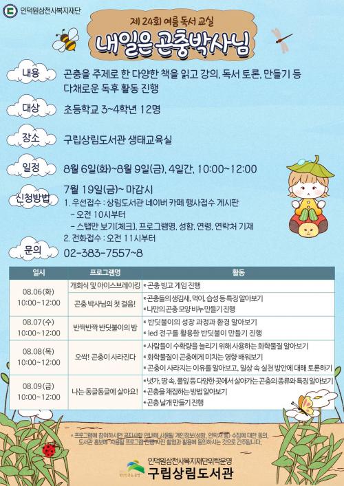 [½Åµ¿¾Æ¹æ¼Û=À̽ŵ¿±âÀÚ] ÀºÆò±¸(±¸Ã»Àå ±è¹Ì°æ)Àº ±¸¸³»ó¸²µµ¼­°ü¿¡¼­ Á¦24ȸ ¿©¸§ µ¶¼­±³½Ç ¡®³»ÀÏÀº °ïÃæ¹Ú»ç´Ô¡¯À» ¿î¿µÇÑ´Ù°í ¹àÇû´Ù. ¿©¸§ µ¶¼­±³½ÇÀº ³»´Þ 6ÀϺÎÅÍ 9ÀϱîÁö Ã¥À» ÅëÇØ °ïÃæ¿¡ ´ëÇØ ¾Ë¾Æº¸´Â ³»¿ëÀ¸·Î ¿­¸°´Ù. »ýÅÂ¿Í ÀÚ¿¬º¸È£¿¡ ´ëÇÑ ¾î¸°À̵顦