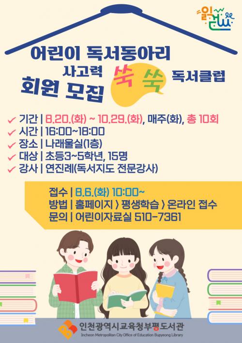 [½Åµ¿¾Æ¹æ¼Û ÀÎõ= À±¹Î½Ä±âÀÚ] ÀÎõ±¤¿ª½Ã±³À°Ã»ºÎÆòµµ¼­°ü(°üÀå ±èÀ翵)Àº ÀÎõ½Ã±³À°Ã» ¿ªÁ¡»ç¾÷ÀÎ ÀаȾ² ¹®È­ È®»êÀ» À§ÇØ 8¿ù 20ÀϺÎÅÍ 10¿ù 29ÀϱîÁö ¡®2024³â ÇϹݱ⠾ÀÌ µ¶¼­µ¿¾Æ¸® ¡¸»ç°í·Â ¾¦¾¦ µ¶¼­Å¬·´¡¹¡¯À» ¿î¿µÇÑ´Ù. À̹ø µ¶¼­µ¿¾Æ¸®´Â ´Ù¾çÇÑ ÁÖ¡¦