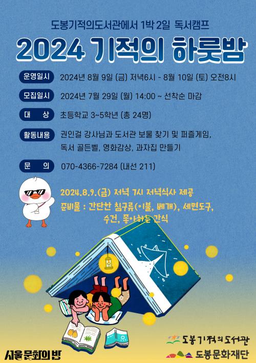 [½Åµ¿¾Æ¹æ¼Û=À̽ŵ¿±âÀÚ] µµºÀ±¸(±¸Ã»Àå ¿À¾ð¼®) µµºÀ±âÀûÀǵµ¼­°üÀº 8¿ù 9ÀÏ~10ÀÏ ÃʵîÇлýÀ» ´ë»óÀ¸·Î µµºÀ±âÀûÀǵµ¼­°ü¿¡¼­ 1¹Ú 2ÀÏ µ¶¼­Ä·ÇÁ ¡®2024 ±âÀûÀÇ ÇÏ·í¹ã¡¯ Çà»ç¸¦ °³ÃÖÇÑ´Ù. ¡®¼­¿ï ¹®È­ÀÇ ¹ã¡¯°úµµ ¿¬°èÇØ ¿­¸®´Â À̹ø Çà»ç´Â µ¶¼­¹®È­±âȹÀÚ ±ÇÀΰɡ¦