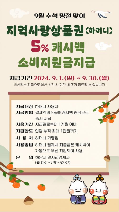 [½Åµ¿¾Æ¹æ¼Û=À̽ŵ¿±âÀÚ]Çϳ²½Ã(½ÃÀå ÀÌÇöÀç)´Â Ãß¼® ¸íÀý ¼Òºñ ÃËÁøÀ» À§ÇØ ¿À´Â 9¿ù 1ÀϺÎÅÍ ¿¹»ê ¼ÒÁø ½Ã±îÁö Çϳ²½Ã Áö¿ª»ç¶û»óǰ±ÇÀÎ ¡®ÇϸӴϡ¯ °áÁ¦ ±Ý¾×ÀÇ 5%¸¦ ij½Ã¹é ÇüÅÂÀÇ ¼ÒºñÁö¿ø±ÝÀ¸·Î ¼±Âø¼ø Áö±ÞÇÏ´Â À̺¥Æ®¸¦ ÁøÇàÇÑ´Ù. À̹ø À̺¥Æ®´Â Áö¿ª ³» ¼Ò¡¦