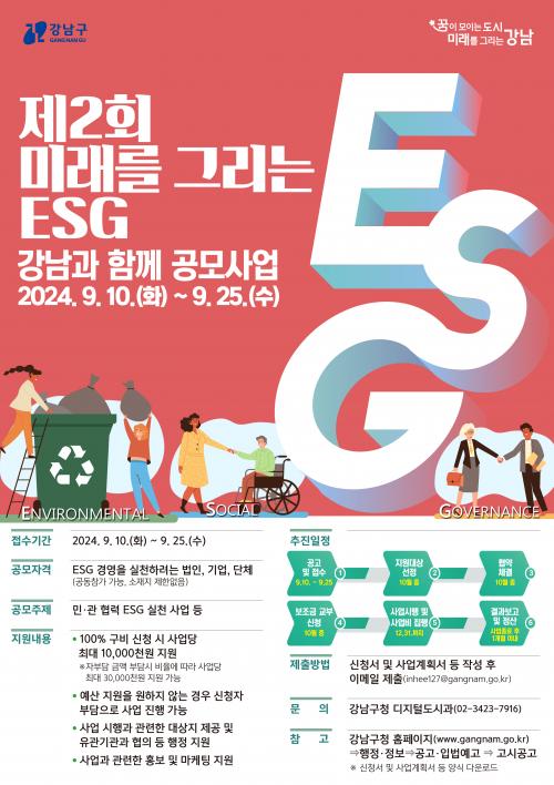 [½Åµ¿¾Æ¹æ¼Û=À̽ŵ¿±âÀÚ] °­³²±¸(±¸Ã»Àå Á¶¼º¸í)°¡ ESG °æ¿µÀ» ½ÇõÇÏ·Á´Â ¹ýÀÎ, ±â¾÷, ´Üü¸¦ ¹ß±¼ÇØ ´Ù¾çÇÑ È°µ¿À» Áö¿øÇÏ´Â ¡®Á¦2ȸ ¹Ì·¡¸¦ ±×¸®´Â ESG, °­³²°ú ÇÔ²²¡¯ °ø¸ð»ç¾÷À» ÃßÁøÇÑ´Ù. ±¸´Â Áö³­ÇØ ¡®Á¦1ȸ ¹Ì·¡¸¦ ±×¸®´Â ESG, °­³²°ú ÇÔ²²¡¯ °ø¸ð»ç¾÷À» Å롦
