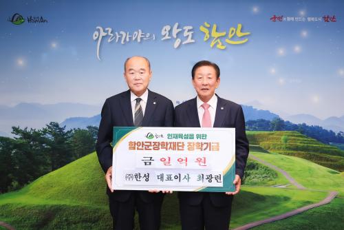 [½Åµ¿¾Æ¹æ¼Û ÇÔ¾È=À̽ŵ¿±âÀÚ]ÇԾȱº ´ë»ê¸é¿¡ ¼ÒÀçÇÑ ¹æ»ê Çù·Â¾÷üÀÎ (ÁÖ)ÇѼº ÃÖ±¤·Ã ´ëÇ¥´Â 20ÀÏ ÇԾȱºÃ»À» ¹æ¹®ÇØ Áö¿ªÀÎÀçÀ°¼ºÀ» À§ÇÑ ÀåÇбâ±Ý 1¾ï ¿øÀ» ±º ÀåÇÐÀç´Ü¿¡ ±âŹÇß´Ù. ÇԾȱº Ä¥¼­¸é Ãâ½ÅÀÎ ÃÖ±¤·Ã ´ëÇ¥´Â ¹ÎÁÖÆòÅë ÇԾȱºÇùÀÇȸÀåÀÌÀÚ ÇԾȱºÀ塦