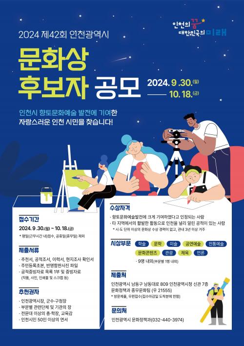 [½Åµ¿¾Æ¹æ¼Û ÀÎõ= À±¹Î½Ä±âÀÚ] ÀÎõ½Ã°¡ Á¦42ȸ ¹®È­»ó Èĺ¸ÀÚ¸¦ ã´Â´Ù. ÀÎõ±¤¿ª½Ã´Â 9¿ù 30ÀÏ ~ 10¿ù 18ÀϱîÁö Á¦42ȸ ¹®È­»ó Èĺ¸ÀÚ¸¦ °ø¸ðÇÑ´Ù°í ¹àÇû´Ù. ¹®È­»óÀº ÇâÅä ¹®È­¿¹¼úÁøÈï°ú Áö¿ª»çȸ ¹ßÀü ±â¿©¿¡ °øÀûÀÌ Å« ÀÎõ ½Ã¹Î¿¡°Ô ½Ã»óÇÏ´Â »óÀ¸·Î, ¡¦