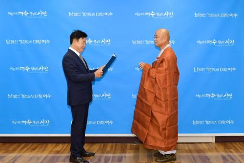 [½Åµ¿¾Æ¹æ¼ÛÀü³²¿©¼ö=±è±â³² ±âÀÚ] ¿©¼ö½Ã(½ÃÀå Á¤±â¸í)´Â Áö³­ 11ÀÏ Àü¶ó³²µµ À¯Çü¹®È­À¯»êÀ¸·Î ÁöÁ¤µÈ ¡®¿©¼ö ´Þ¸¶»ç ¼ÒÀå ¿¹³ä¹ÌŸµµ·®Âü¹ý ±Ç6-10¡¯ ÁöÁ¤¼­¸¦ ´ëÇѺұ³Á¶°èÁ¾ ´Þ¸¶»ç¿¡ Àü´ÞÇß´Ù. ½ÃÀå½Ç¿¡¼­ ¿­¸° Àü´Þ½Ä¿¡ Á¤±â¸í ½ÃÀå°ú ´Þ¸¶»ç ÁÖÁö µµÇؽº¡¦
