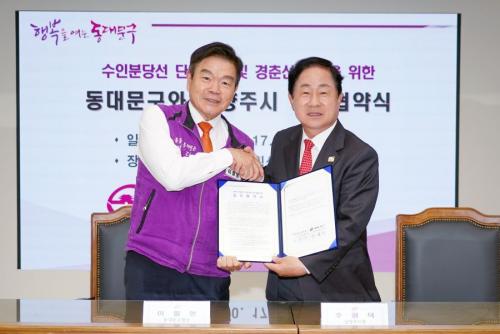 [½Åµ¿¾Æ¹æ¼Û µ¿´ë¹®±¸=À̽ŵ¿±âÀÚ] µ¿´ë¹®±¸(±¸Ã»Àå ÀÌÇÊÇü)´Â 10¿ù 17ÀÏ µ¿ºÏ±Ç ±³Åë»ç¾÷ÀÇ ÇÙ½ÉÀΠû·®¸®¿ª°ú ¿Õ½Ê¸®¿ª °£ 1km ´Ü¼±Àüö ½Å¼³À» À§ÇØ ³²¾çÁÖ½Ã¿Í ¾÷¹« Çù¾àÀ» ü°áÇß´Ù. Çù¾à½ÄÀº ÀÌÇÊÇü µ¿´ë¹®±¸Ã»Àå, ÁÖ±¤´ö ³²¾çÁÖ½ÃÀå µî °ü°èÀÚµéÀÌ Âü¼®ÇÑ °¡¡¦