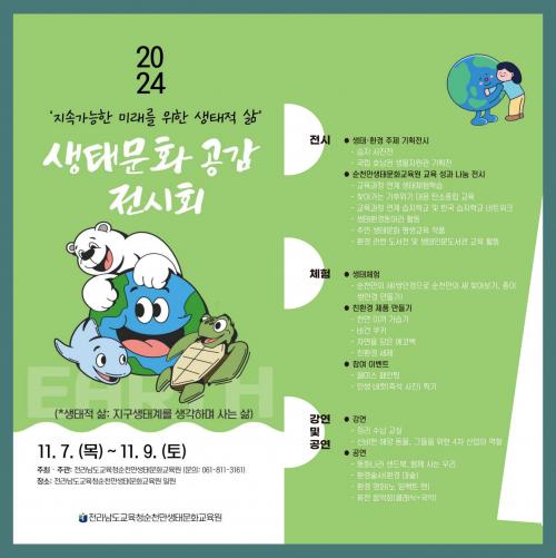 [½Åµ¿¾Æ¹æ¼Û ¼øÃµ½Ã=À̽ŵ¿±âÀÚ] Àü¶ó³²µµ±³À°Ã»¼øÃµ¸¸»ýŹ®È­±³À°¿øÀº 11¿ù 7ÀÏ(¸ñ)ºÎÅÍ 11¿ù 9ÀÏ(Åä)±îÁö Àü³² À¯‧ÃÊ‧Áß‧°í Çлý ¹× ±³Á÷¿ø, Çкθð, Áö¿ª¹Î µîÀ» ´ë»óÀ¸·Î ¡¸2024. »ýŹ®È­ °ø°¨ Àü½Ãȸ¡¹¸¦ °³ÃÖÇÑ´Ù. ¿ÃÇØ·Î ¼¼ ¹øÂ°¸¦ ¸ÂÀÌ¡¦
