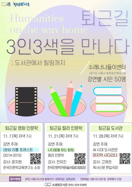 [½Åµ¿¾Æ¹æ¼Û ½ÃÈï½Ã=À̽ŵ¿±âÀÚ] ½ÃÈï½Ã ¼Ò·¡ºûµµ¼­°üÀº ¼Ò·¡³Ê³ªµéÀ̼¾ÅÍ¿Í ÇÔ²²ÇÏ´Â ¡®Åð±Ù±æ 3ÀÎ 3»ö¡¯ Àι®ÇÐ °­¿¬À» 11¿ùºÎÅÍ ÃÑ 3ȸ¿¡ °ÉÃÄ ¼Ò·¡³Ê³ªµéÀ̼¾ÅÍ¿¡¼­ °³ÃÖÇÑ´Ù. ¡®Åð±Ù±æ 3ÀÎ 3»ö¡¯Àº ¿µÈ­, Ä÷¯, µµ¼­°üÀ̶ó´Â ¼¼ °¡Áö ÁÖÁ¦·Î ±¸¼ºµÅ »îÀÇ ÁöÇý¿¡¡¦