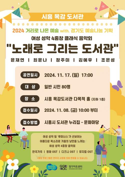 [½Åµ¿¾Æ¹æ¼Û ½ÃÈï½Ã=À̽ŵ¿±âÀÚ] ½ÃÈï½Ã ¸ñ°¨µµ¼­°üÀº 11¿ù 17ÀÏ ¿ÀÈÄ 5½ÃºÎÅÍ ¾à 50ºÐ°£ µµ¼­°ü ³» °ø¿¬Àå¿¡¼­ ½Ã¹Î 80¸íÀ» ´ë»óÀ¸·Î Ŭ·¡½Ä À½¾Çȸ¸¦ ¿¬´Ù. ¿©¼º ¼º¾Ç°¡ 4ÀÎÀ¸·Î ±¸¼ºµÈ ¼º¾ÇÆÀ ¡®·ç¹Ì³Ê½º¡¯¿Í ÇǾƴϽºÆ®°¡ ÇÔ²² ÁøÇàÇÏ´Â À̹ø À½¾Çȸ´Â Àü¹® °ø¿¬¡¦