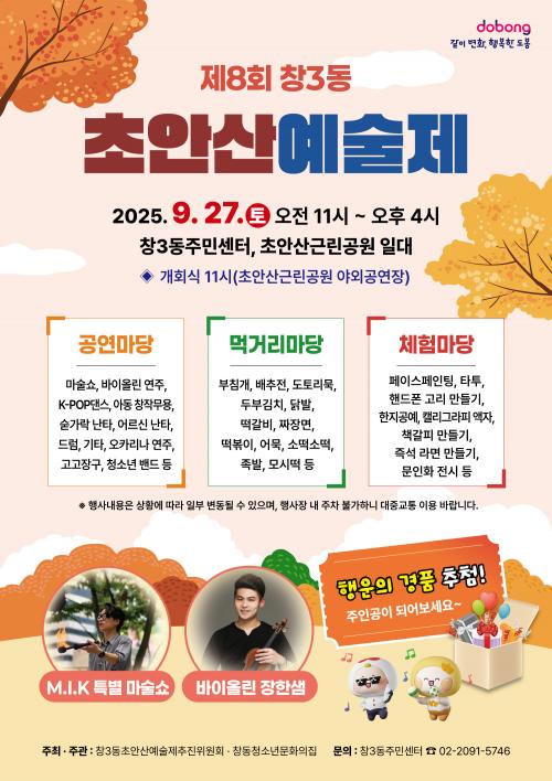 [½Åµ¿¾Æ¹æ¼Û µµºÀ±¸=À̽ŵ¿±âÀÚ] ¼­¿ï µµºÀ±¸ â3µ¿ÀÌ 9¿ù 27ÀÏ Ã¢3µ¿Áֹμ¾ÅÍ¿Í ÃʾȻê±Ù¸°°ø¿ø¿¡¼­ ¡®Á¦8ȸ ÃʾȻ꿹¼úÁ¦¡¯¸¦ °³ÃÖÇÑ´Ù. ÃʾȻ꿹¼úÁ¦´Â Áֹΰú Áö¿ª ´Üü°¡ Á÷Á¢ ±âȹÇϰí Âü¿©Çϴ â3µ¿ ´ëÇ¥ ¸¶À» ÃàÁ¦´Ù. ÀÚ¿¬°ú ¹®È­¿¹¼úÀÌ Á¶È­¸¦ ÀÌ·ç´Â ÃàÁ¦¡¦