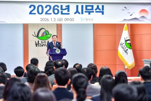 [½Åµ¿¾Æ¹æ¼Û °æ³²ÇÔ¾È=À̽ŵ¿±âÀÚ] ÇԾȱºÀº Áö³­ 2ÀÏ ¿ÀÀü 9½Ã ±ºÃ» 3Ãþ ´ëȸÀǽǿ¡¼­ °øÁ÷ÀÚ 200¿© ¸íÀÌ Âü¼®ÇÑ °¡¿îµ¥ ½Ã¹«½ÄÀ» ¿­°í º´¿À³â »õÇØ ¾÷¹«¸¦ ½ÃÀÛÇß´Ù°í ¹àÇû´Ù. À̳¯ ½Ã¹«½ÄÀº ±¹¹ÎÀǷʸ¦ ½ÃÀÛÀ¸·Î Á¶±ÙÁ¦ ÇԾȱº¼öÀÇ Á¤ºÎ Æ÷»ó°ú ǥâÀå ¼ö¿©, ½Å³â¡¦