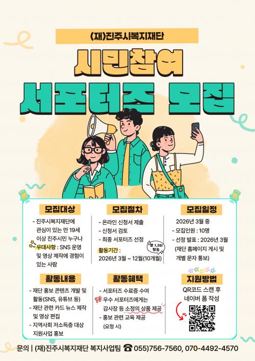 [½Åµ¿¾Æ¹æ¼Û °æ³²ÁøÁÖ=³²±Ã¿µ±â±âÀÚ] ÁøÁֽú¹ÁöÀç´ÜÀº ½Ã¹Î°úÀÇ ¼ÒÅë°ú °ø°¨À» È®´ëÇϰí Áö¿ª»çȸ º¹Áö³×Æ®¿öÅ©¸¦ °­È­Çϱâ À§ÇØ 2026³â¡®Á¦1±â ½Ã¹ÎÂü¿©(SNS) ¼­Æ÷ÅÍÁ¸¦ ¸ðÁýÇÑ´Ù°í 4ÀÏ ¹àÇû´Ù. À̹ø »ç¾÷Àº ½Ã¹ÎÀÌ Á÷Á¢ º¹Áö ÇöÀåÀ» üÇèÇÏ°í °³ÀÎ SNS¸¦ ÅëÇØ ¡¦