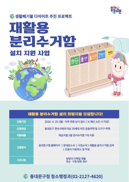 [½Åµ¿¾Æ¹æ¼Û µ¿´ë¹®±¸=À̽ŵ¿±âÀÚ] ¼­¿ï µ¿´ë¹®±¸´Â »ýȰÆó±â¹° ¹ß»ý·®À» ÁÙÀ̰í ÀçȰ¿ë·üÀ» ³ôÀ̱â À§ÇØ ºÐ¸®¹èÃâ ¿©°ÇÀÌ ºÎÁ·ÇÑ ¼Ò±Ô¸ð °øµ¿ÁÖÅðú ´Ù°¡±¸ÁÖÅÃÀ» ´ë»óÀ¸·Î ¡®ÀçȰ¿ë ºÐ¸®¼ö°ÅÇÔ ¼³Ä¡ Áö¿ø »ç¾÷¡¯À» È®´ë ÃßÁøÇÑ´Ù°í ¹àÇû´Ù. ¾ÆÆÄƮó·³ º°µµ ºÐ¸®¼ö¡¦