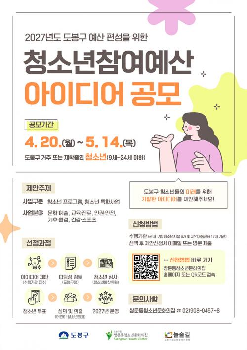[½Åµ¿¾Æ¹æ¼Û µµºÀ±¸=À̽ŵ¿±âÀÚ] ¼­¿ï µµºÀ±¸°¡ ¡®Ã»¼Ò³âÂü¿©¿¹»êÁ¦¡¯ ¾ÆÀ̵ð¾î °ø¸ð¸¦ ¿À´Â 5¿ù 14ÀϱîÁö ÁøÇàÇÑ´Ù. ¡®Ã»¼Ò³âÂü¿©¿¹»êÁ¦¡¯´Â û¼Ò³âÀÌ Áö¿ª»çȸ¿¡ ÇÊ¿äÇÑ »ç¾÷À» Á÷Á¢ Á¦¾ÈÇϰí, ¿¹»ê Æí¼º °úÁ¤¿¡ Âü¿©ÇØ ½º½º·Î Á¤Ã¥À» °áÁ¤ÇÏ´Â Âü¿©Çü ¹ÎÁÖÁÖÀÇ Á¦¡¦