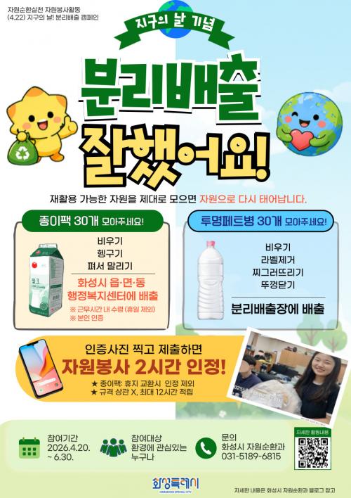 [½Åµ¿¾Æ¹æ¼Û=ÀÌÀçö±âÀÚ] È­¼ºÆ¯·Ê½Ã°¡ 2026³â ¡®Áö±¸ÀÇ ³¯(4¿ù 22ÀÏ)¡¯À» ¸Â¾Æ ½Ã¹ÎµéÀÌ ÀÏ»ó ¼Ó¿¡¼­ ȯ°æ º¸È£¸¦ ½ÇõÇÒ ¼ö ÀÖ´Â ÀÚ¿øºÀ»ç Ȱµ¿ ¡¸ºÐ¸®¹èÃâ ÀßÇß¾î¿ä¡¹ Ä·ÆäÀÎÀ» ¿î¿µÇÑ´Ù°í ¹àÇû´Ù. À̹ø Ȱµ¿Àº Áö±¸ÀÇ ³¯À» ±â³äÇÏ´Â ÀÏȸ¼º Çà»ç¸¦ ³Ñ¾î, ½Ã¹ÎµéÀÌ¡¦