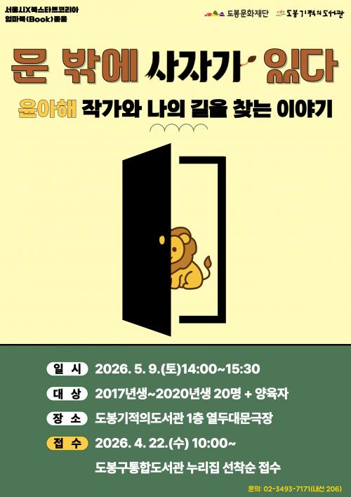 [½Åµ¿¾Æ¹æ¼Û µµºÀ±¸=À̽ŵ¿±âÀÚ] ¼­¿ï µµºÀ±¸ µµºÀ±âÀûÀǵµ¼­°üÀÌ 5¿ù 9ÀÏ µµºÀ±âÀûÀǵµ¼­°ü 1Ãþ ¿­µÎ´ë¹®±ØÀå¿¡¼­ ¡®À±¾ÆÇØ ÀÛ°¡¿ÍÀÇ ¸¸³²¡¯ °­¿¬À» °³ÃÖÇÑ´Ù. À̹ø °­¿¬Àº ¼­¿ïµµ¼­°üÀÇ 2026³â ¾ö¸¶ ºÏ(Book)µ¸¿ò ¡®¿ì¸®µ¿³× ºÏµ¸¿ò¡¯ »ç¾÷ÀÇ Áö¿øÀ» ¹Þ¾Æ ¿­°Ô µÆ´Ù¡¦